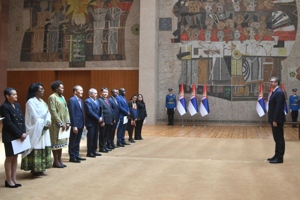 Председник Вучић је амбасадорима пожелео успешан дипломатски мандат и изразио уверење да ће политички дијалог и економска сарадња Србије и осталих земаља наставити да се развијају на обострану корист.